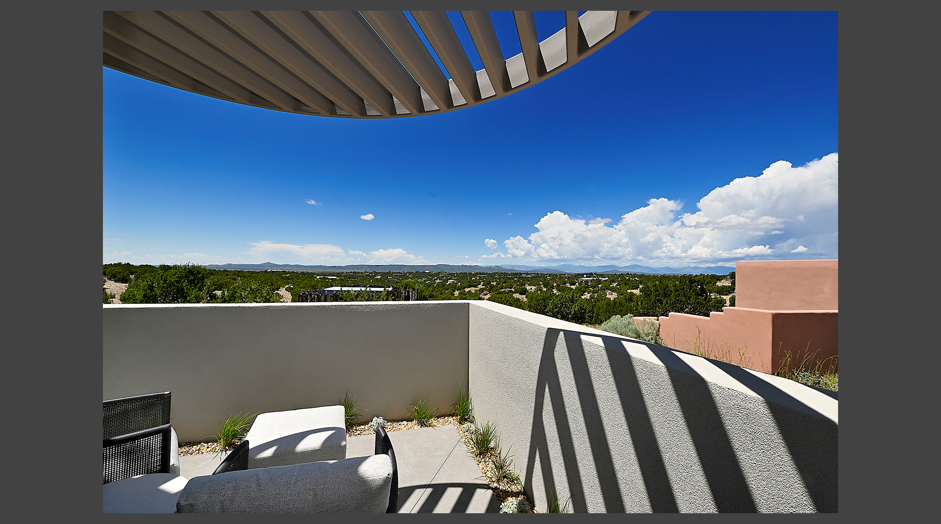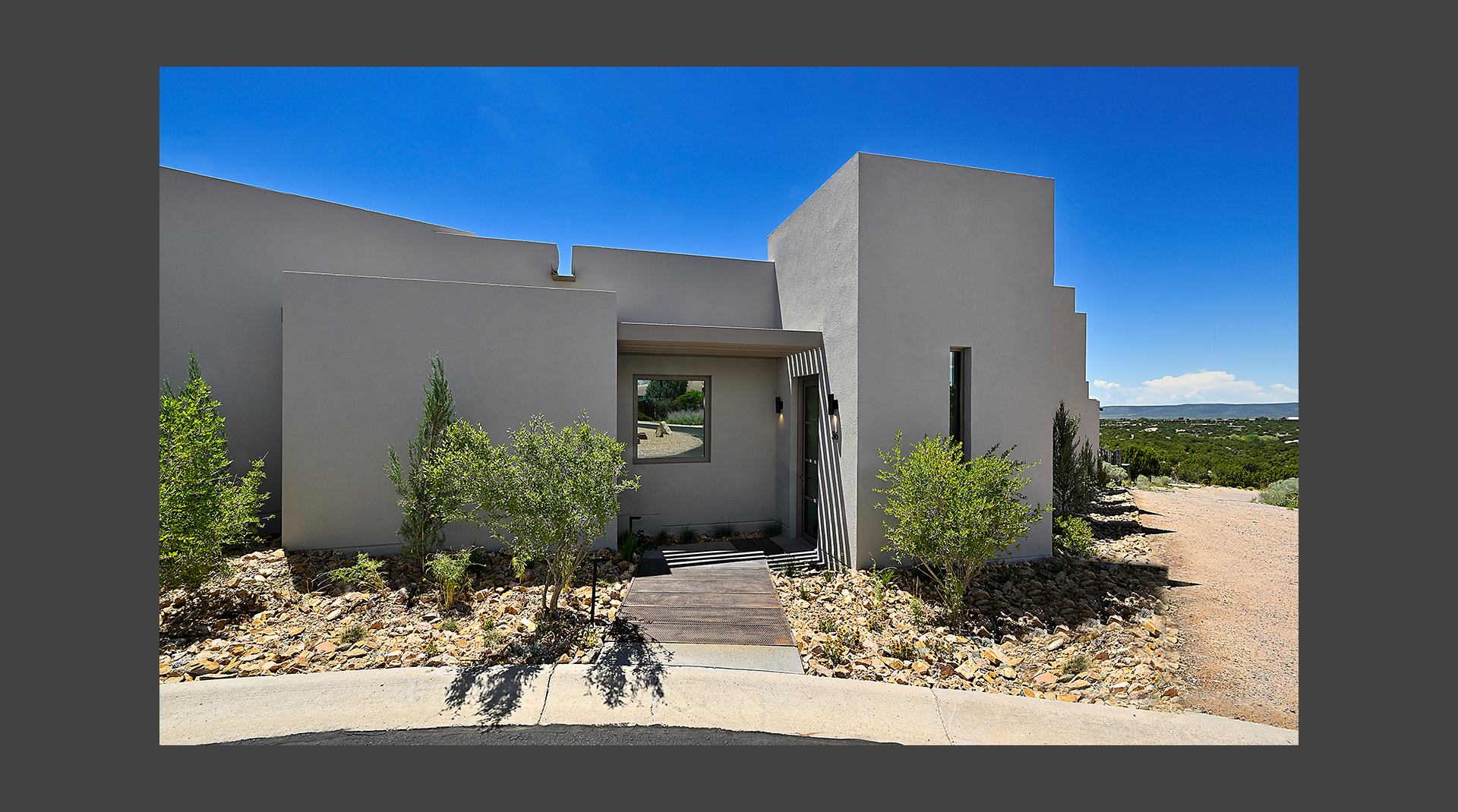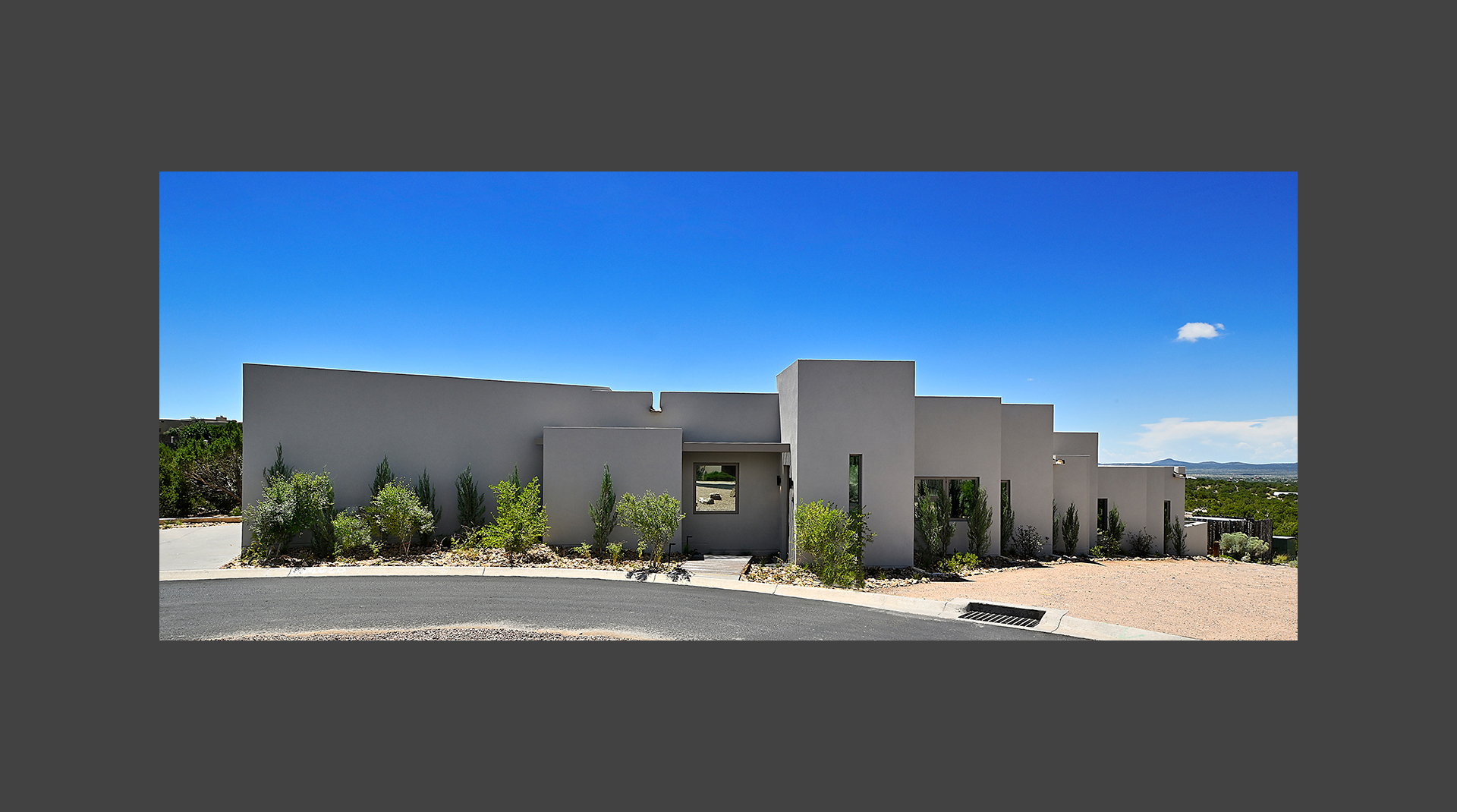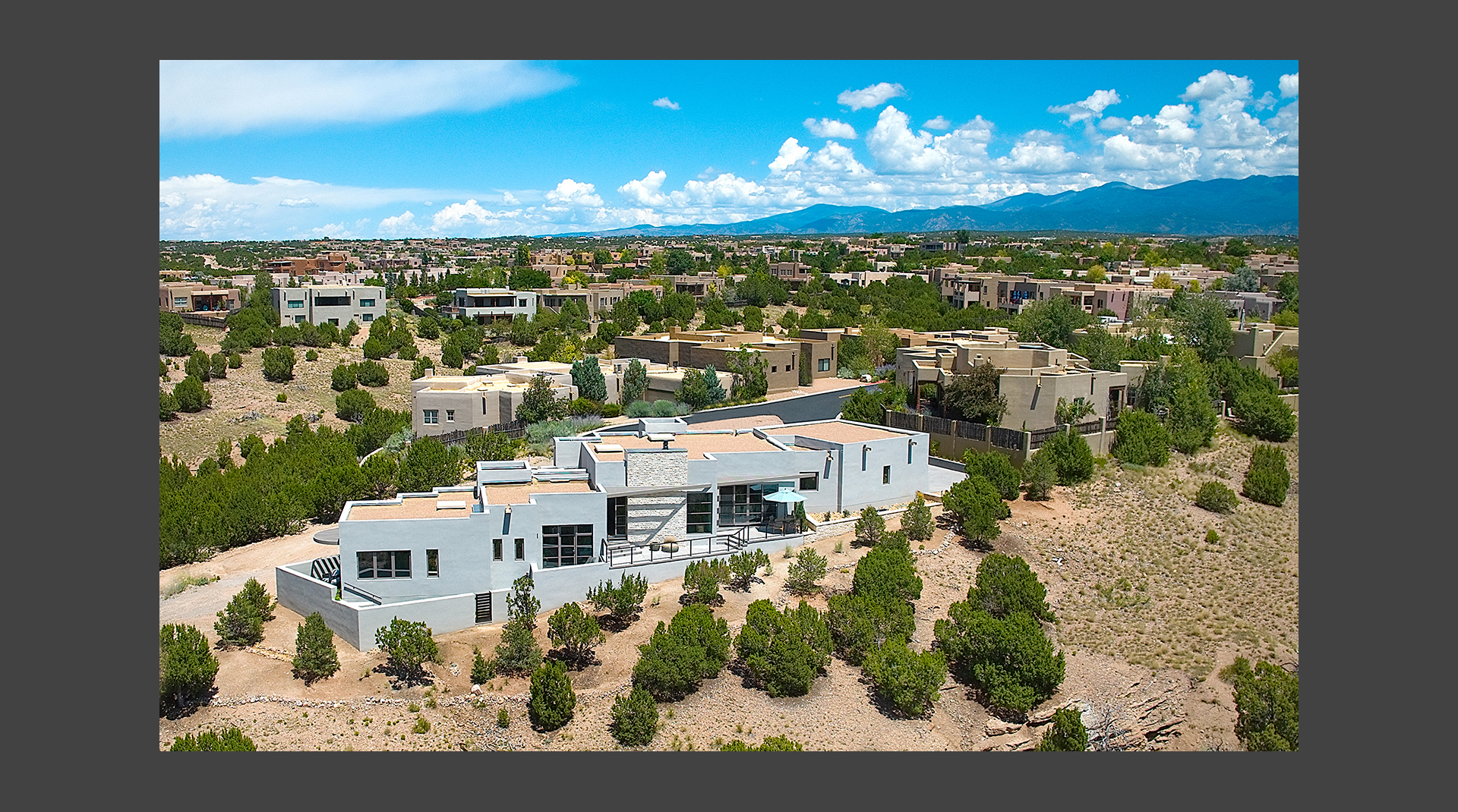Designed to make the most of a very tight, narrow lot with steep drop-offs overlooking a greenbelt, the three-bedroom, three-bathroom home offers sweeping, unobstructed views of both the Jemez and Sandia Mountains. This modern residence showcases colored concrete floors, built-in window blinds, and two striking rotundas crowned with circular skylights. The contemporary design is further emphasized through exposed steel trellis accents and a sleek Viewrail suspension cable railing system on the rear outdoor portal.