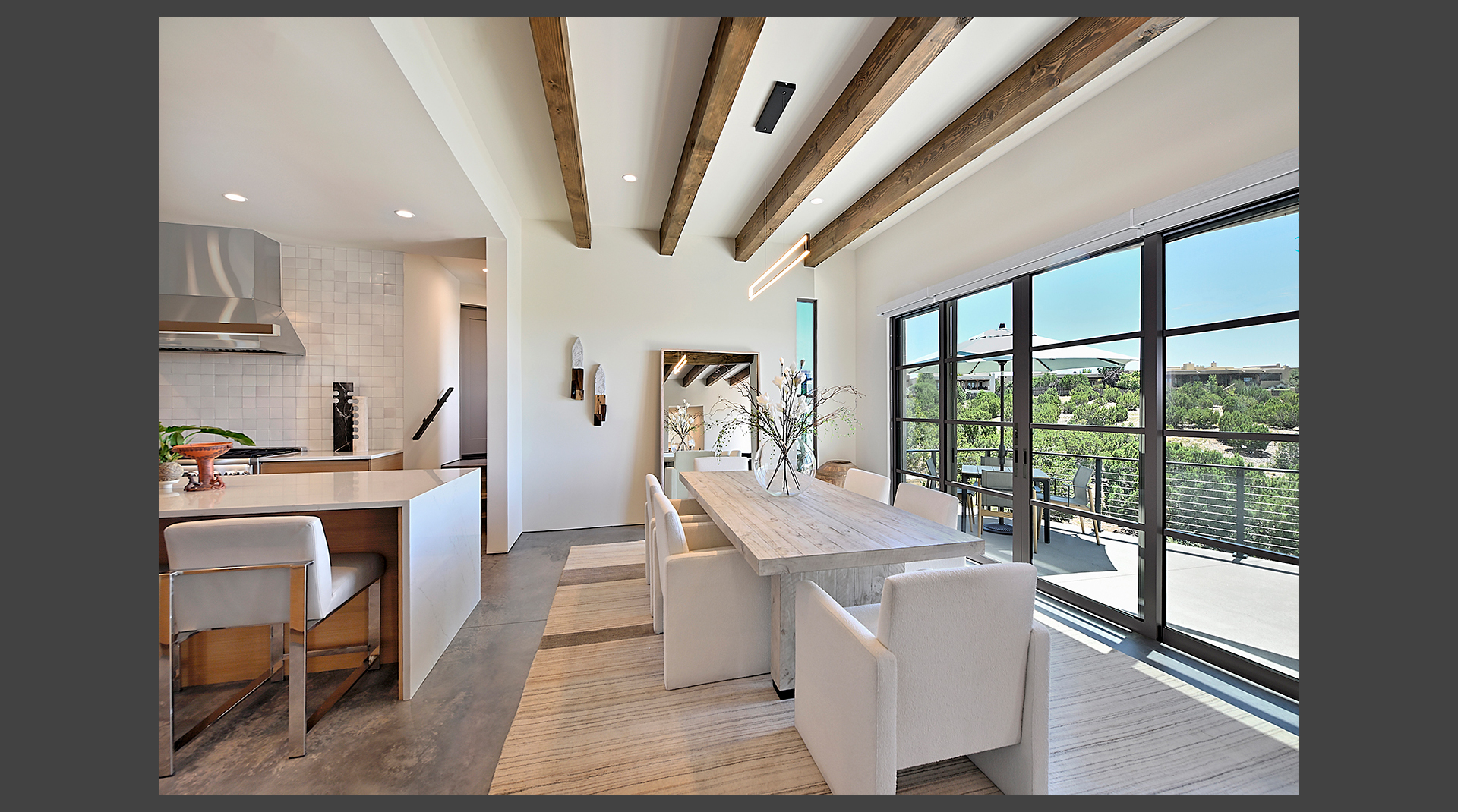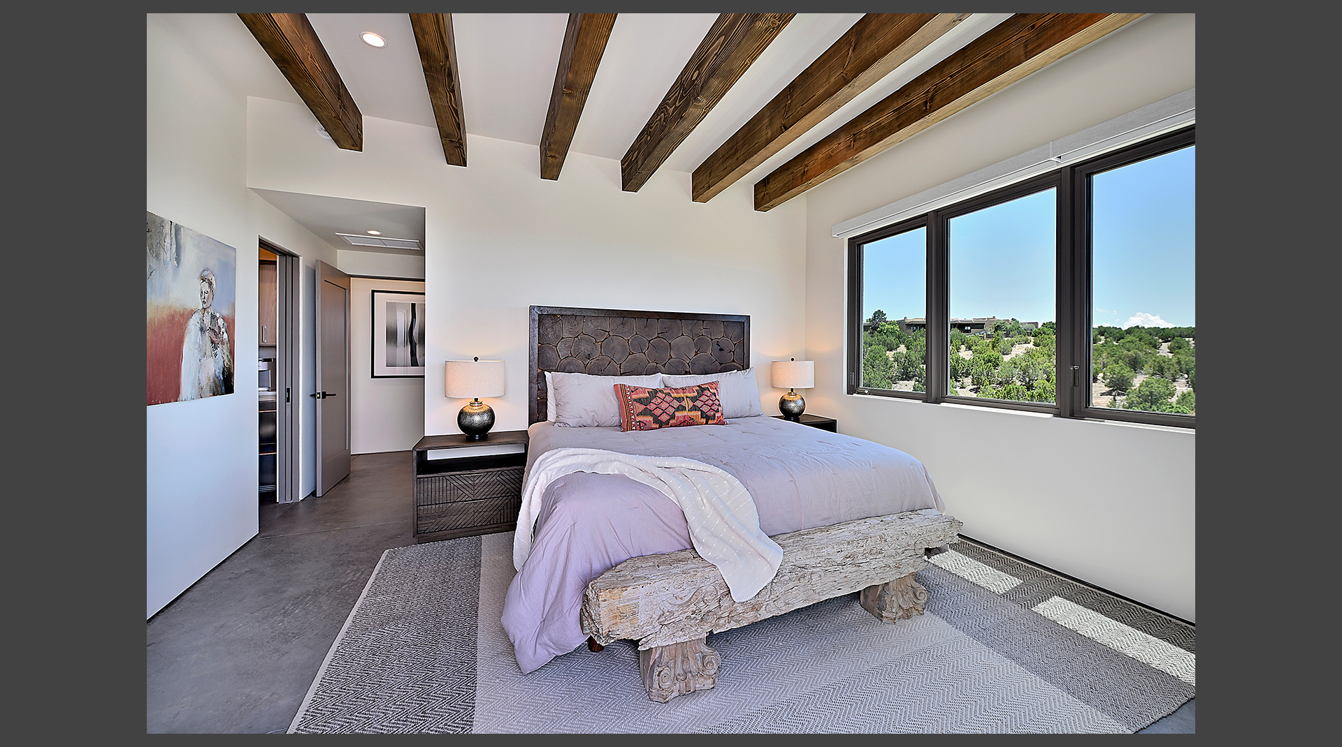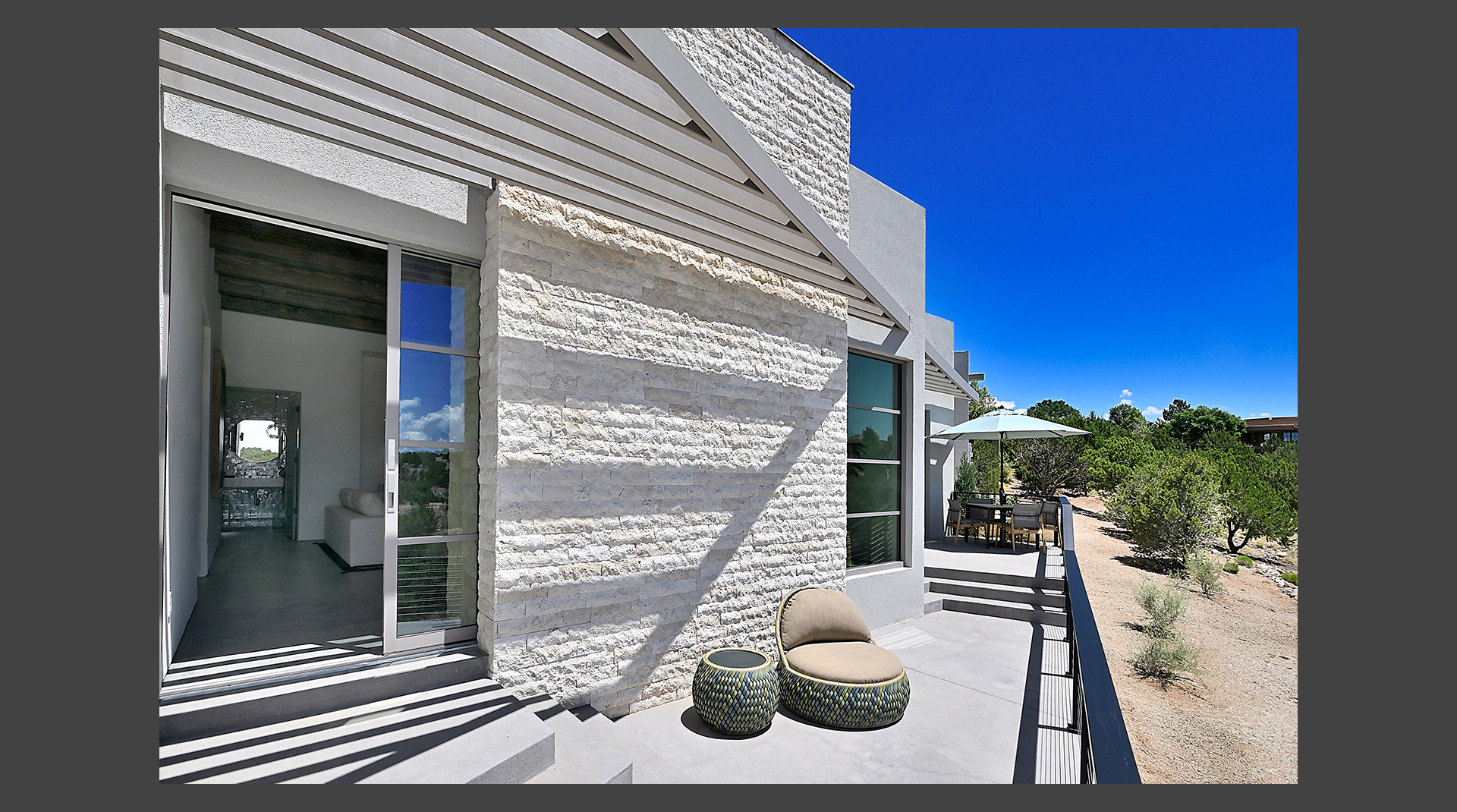 Designed to make the most of a very tight, narrow lot with steep drop-offs overlooking a greenbelt, the three-bedroom, three-bathroom home offers sweeping, unobstructed views of both the Jemez and Sandia Mountains. This modern residence showcases colored concrete floors, built-in window blinds, and two striking rotundas crowned with circular skylights. The contemporary design is further emphasized through exposed steel trellis accents and a sleek Viewrail suspension cable railing system on the rear outdoor portal.