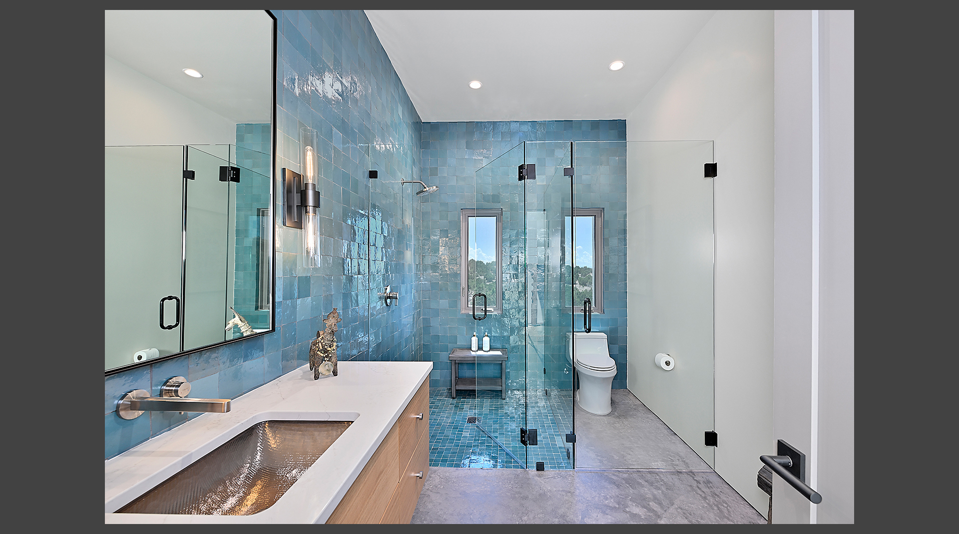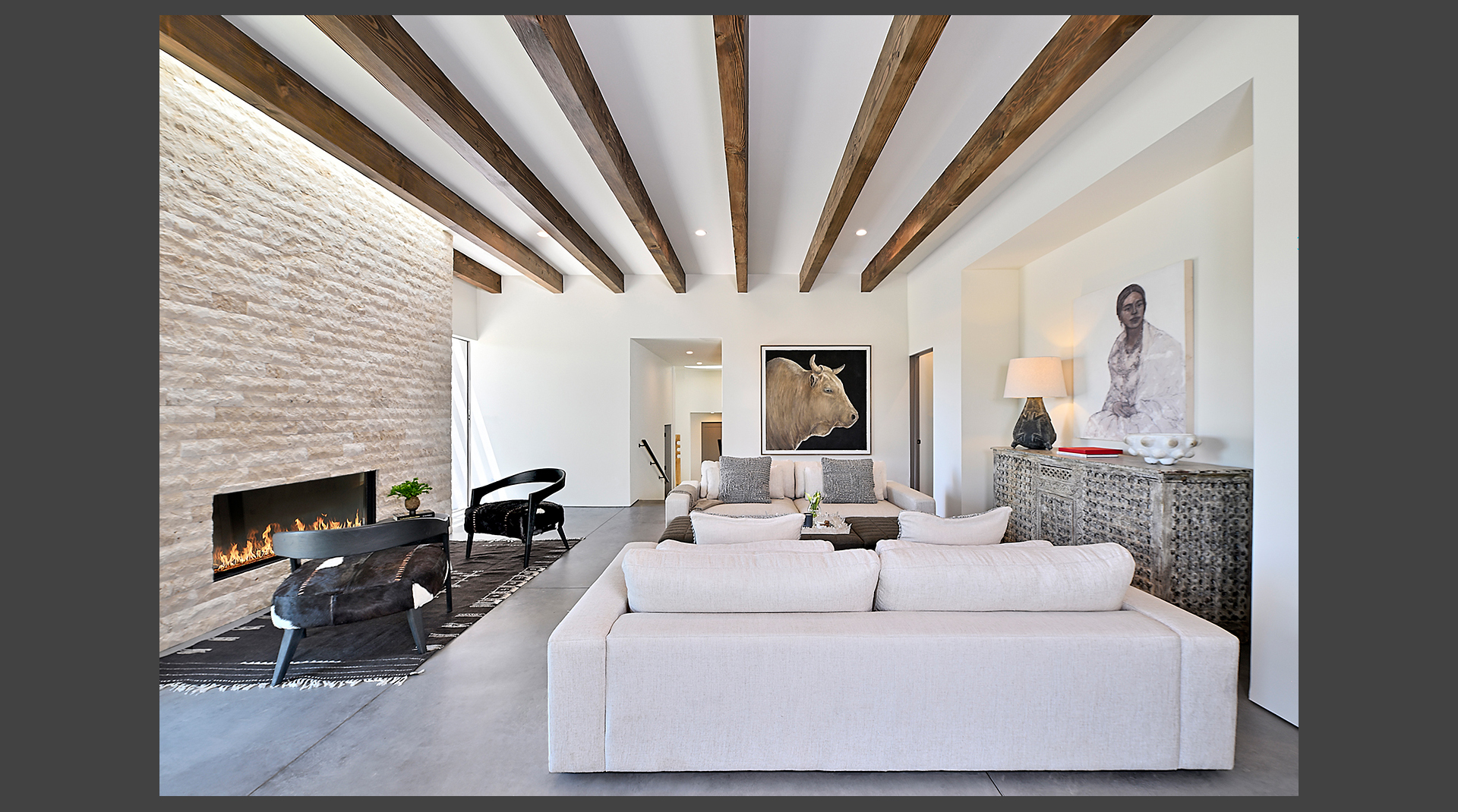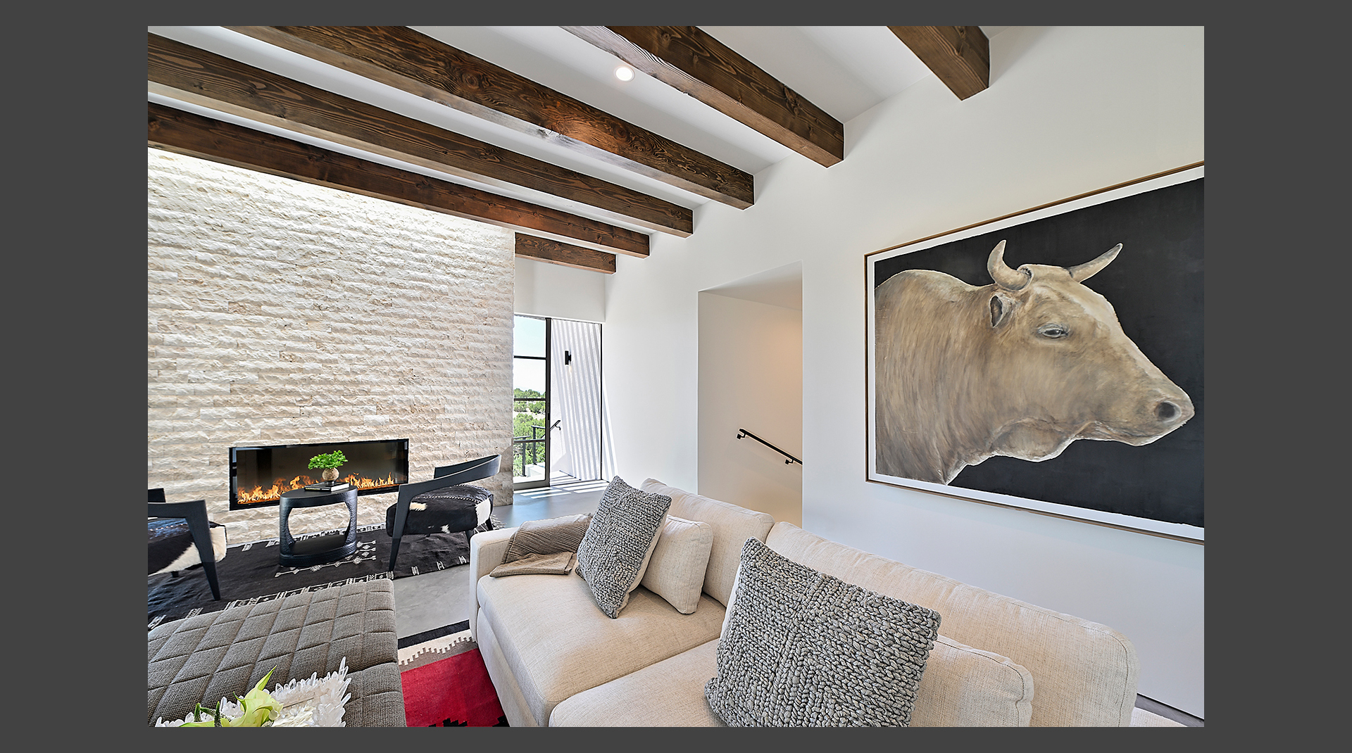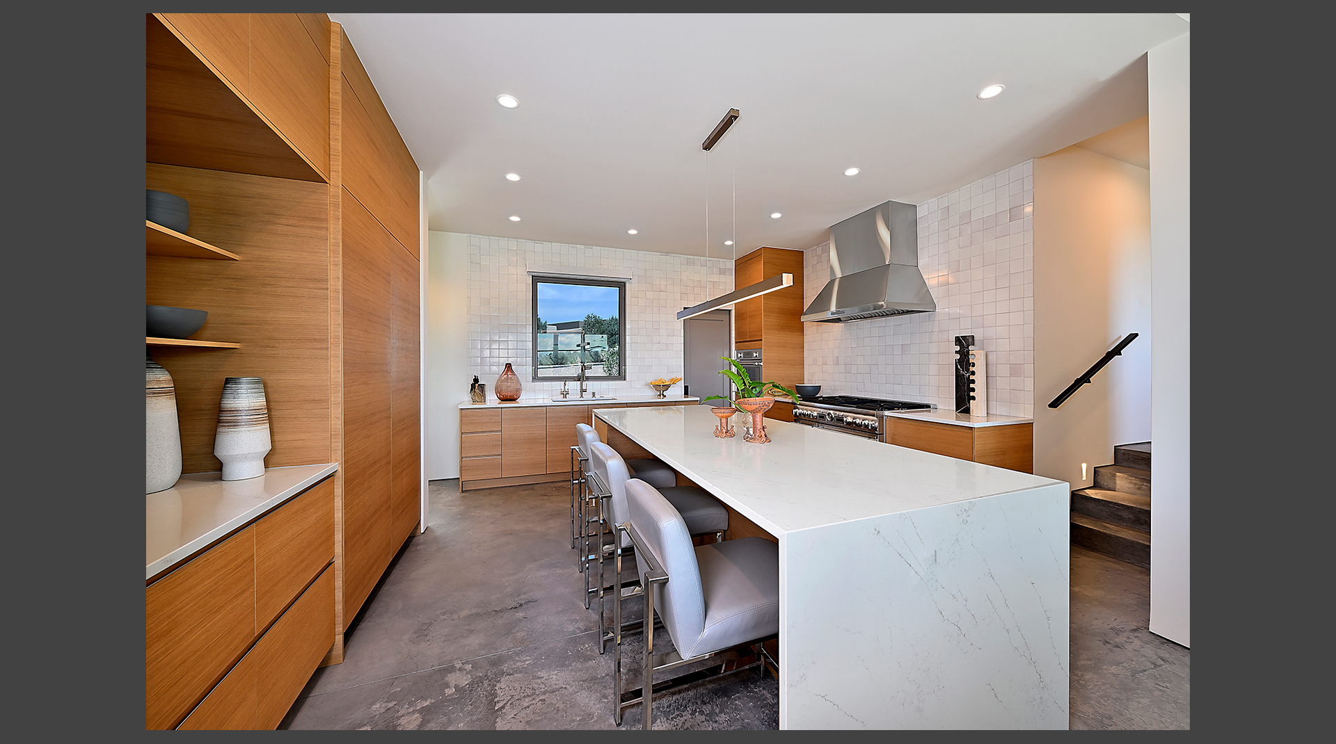 Designed to make the most of a very tight, narrow lot with steep drop-offs overlooking a greenbelt, the three-bedroom, three-bathroom home offers sweeping, unobstructed views of both the Jemez and Sandia Mountains. This modern residence showcases colored concrete floors, built-in window blinds, and two striking rotundas crowned with circular skylights. The contemporary design is further emphasized through exposed steel trellis accents and a sleek Viewrail suspension cable railing system on the rear outdoor portal.